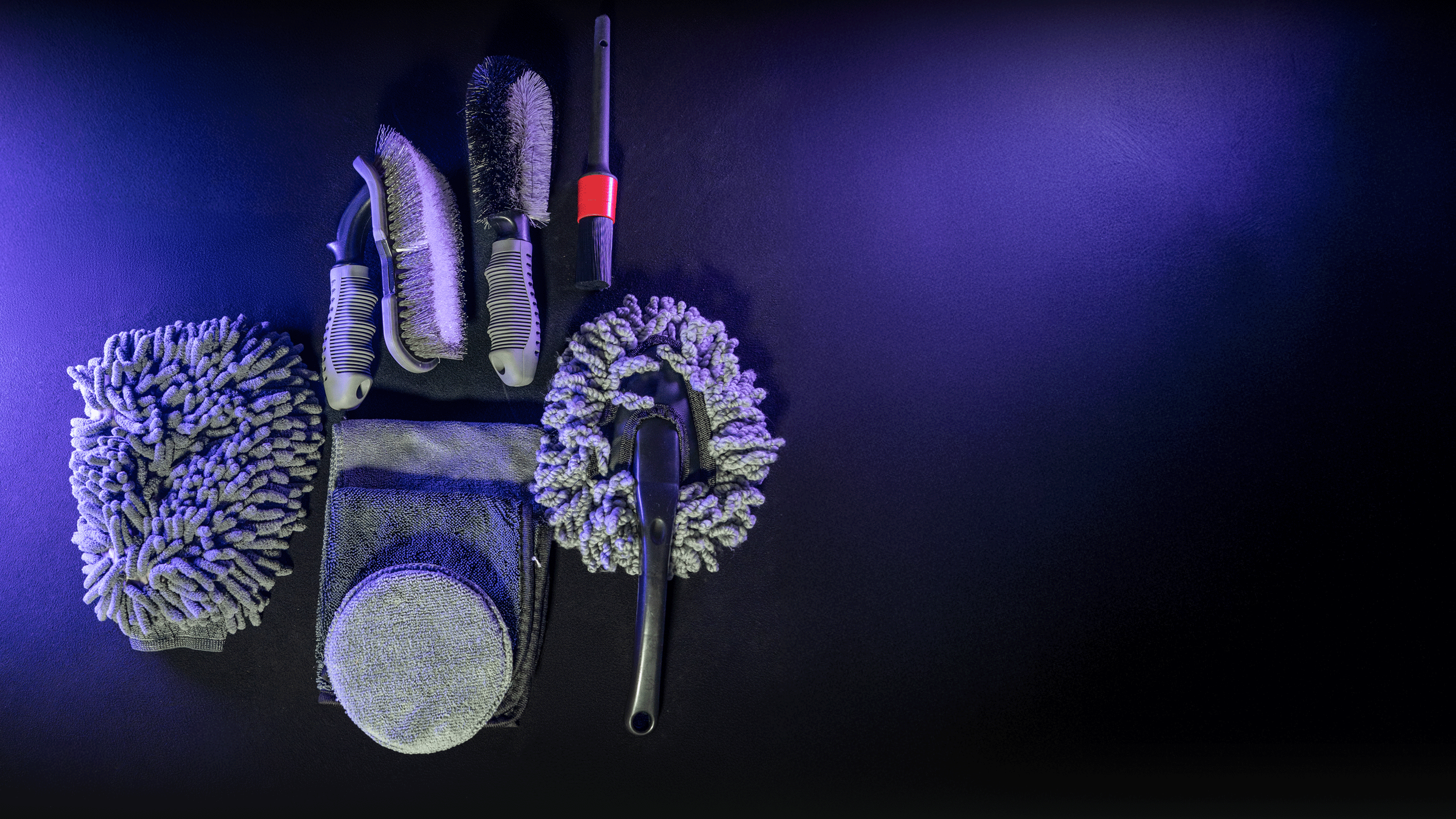 Tyre brush, wheel/hub brush, large cleaning mitt, soft brush, micro fibre towel, fleece towel, micro fibre glass towel, carry/storage bag